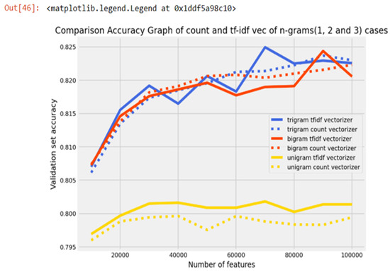 Various approaches to extracting characteristics from the training data were compared. The selection of TF-IDF trigrams as the feature extraction method for the analysis of sentiments is grounded in its ability to comprehensively capture contextual information. Unlike individual words or bigrams, TF-IDF trigrams can effectively capture negation cues, such as “not so good” or “did not like”, by considering the presence of negating terms alongside sentiment-bearing words. Figure 2 shows the accuracy comparison graph for the count vectorizer and TF-IDF vectorizer. Unigrams, bigrams, and trigrams of the TF-IDF vectorizer and the count vectorizer were both used. According to the accuracy of the findings, TF-IDF trigrams outperformed all other methods on the training set. The TF-IDF unigram (between 60,000 and 100,000 features with 79.84% validation accuracy), TF-IDF bigram (100,000 features with 82.04% validation accuracy), and TF-IDF trigram (90,000 features with 82.22% validation accuracy) were all taken into consideration.
