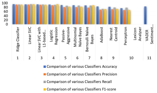 The performance of the various sentiment analysis models on the dataset of tweets is gauged by Figure 3, which shows the comparison of various classifiers with their accuracy, precision, recall, and F1-score. Figure 4 shows the accuracy comparison graph of the test data for tweets. It offers insightful information on how well the algorithms anticipate sentiment from real-time social media data.
