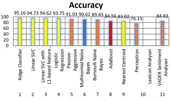 Various classification models were employed to predict attitudes in the test dataset. The supervised learning approach was used to build these models. Among the classification models used in this study were Linear SVC and Linear SVC with L1-based feature selection, Logistic Regression, the Vader emotion analyzer, AdaBoost, Perceptron, Multinomial Naive Bayes, Bernoulli Naive Bayes, Ridge Classifier, Passive-Aggressive, Nearest Centroid, and AdaBoost. Each classifier was trained using the labeled training data before predicting data from the test dataset. To ascertain how well each classifier performed in accurately predicting these attitudes, its accuracy was assessed.