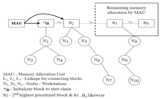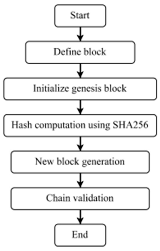 Blockchain operates in a decentralized pattern at all times [19,20,21,22,23]. The greatest language for developing a good blockchain structure is Java. Hence, in the present system, we employed the Java language and the notion of object-oriented programming. Under some situations, we employed hash functions to connect various blocks. To obtain a unique hash, we utilized SHA256 and UTF-8 assistance. Using the Java programming language, we built blocks and chains in a manner similar to that depicted in Figure 1. In each step, we built a network using the graph data structure. We employed routing methods such as Dijkstra’s algorithm to determine the best pathways, as well as Kruskal’s and Prim’s algorithms. Ultimately, we mined blocks for hash value gating, with all blocks being random in a decentralized system.