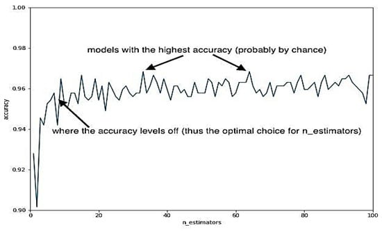 An increase in the random forest’s tree count has never been shown to negatively impact performance. Until a certain threshold is reached, the performance gains from adding more trees will plateau. However, the complexity of the algorithm increases as the number of trees grows. It takes more computing power to run an algorithm with higher complexity. Adding complexity to the model is usually worthwhile if doing so increases speed, but we should avoid doing so unless necessary. An elbow graph can be used to identify the optimum number of estimators in ensemble learning such as random forest. An elbow graph shown in Figure 1 can help us zero in on the optimal point. The elbow graph is a simplified yet effective model for maximizing efficiency. Let us run a Grid Search with an estimator set between 1 and 100 to determine which value is best. We are going to use the complete result from the Grid Search this time, rather than just the best parameters, like we described before. These data can be found in the cv results parameter. This dictionary contains a great deal of information, but we will only be using one of the keys—the mean test score—for our purposes. To save these numbers, let us create a variable. We can make a graph of these numbers using matplotlib. The graph flattens out after about 10 trees, as can be seen here. Given how unpredictable it is, the best model appeared at n estimators = 33 and n estimators = 64. As our goal is to use as few estimators as possible while achieving optimal performance, a value of around 10 seems about right. Our random forest model can be constructed with the best possible tree count at this point. Elbow graphs are useful for when we want to discover the minimum amount of complexity that will give best performance, which occurs frequently when we add complexity to a model.
