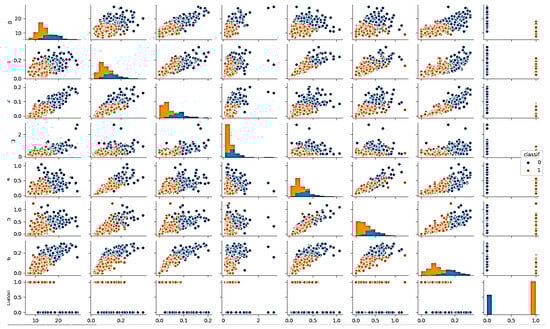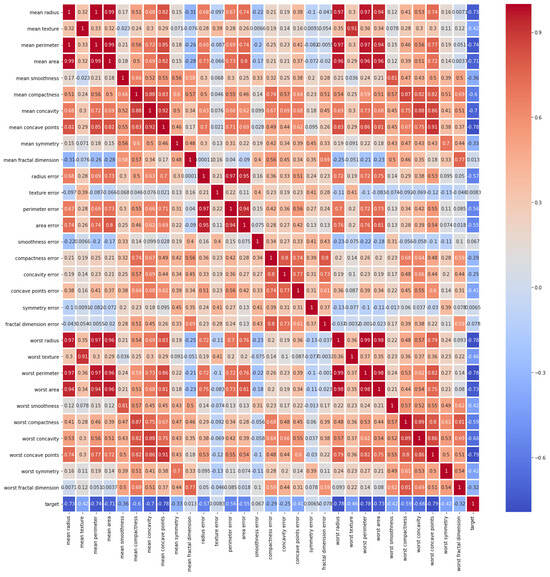 The dataset used for breast cancer diagnosis in this paper is the “Breast Cancer Wisconsin (Diagnostic) Data Set”, commonly known as the Wisconsin Breast Cancer dataset. This dataset consists of 569 samples, where each sample represents a biopsy of breast tissue. There are 30 features computed from each digitized image of a biopsy, including the mean, standard error, and worst (the mean of the three largest values) of ten different characteristics such as the radius, texture, and smoothness. The target variable is binary, indicating whether the biopsy is diagnosed as malignant (1) or benign (0).