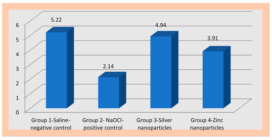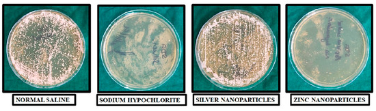 NaOCl reduced the colony counts to 102 CFU’s/mL (colony forming units per milliiter) from an initial inoculation of 108 CFU’s/mL. In comparison with other groups, there was a statistically significant reduction in colony counts in the NaOCl group (2.1462 ± 0.0818) (p < 0.0001). Saline (0.9% weight/volume) showed the least-effective antimicrobial efficacy (5.2263 ± 0.0329) when compared to NaOCl (2.1462 ± 0.0818) silver nanoparticles (4.9401 ± 0.39743) and zinc nanoparticles (3.9129 ± 0.0300) (p < 0.0001) (Table 1).