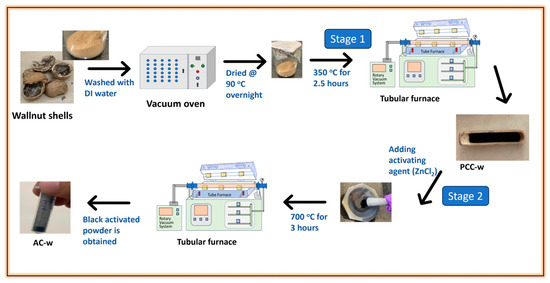 PCC-w powder was mixed with ZnCl2 until uniform texture in the weight ratio of 1:4. Again, the mixed powder was filled in a boat, pressed, and transferred to the tube furnace. This time it is heated to 700 °C, an optimized temperature from the previous literature, to remove organic impurities and activate the carbon in an inert atmosphere with the same Ar gas flow for 3 h. Finally, the obtained sample was rinsed in 10% HCL acid to remove ash and then washed with DI water several times. Dried the final sample and mentioned as walnut shell-derived activated carbon (AC-w). A schematic representation of the preparation of AC-w from walnut shells is shown in Figure 1.