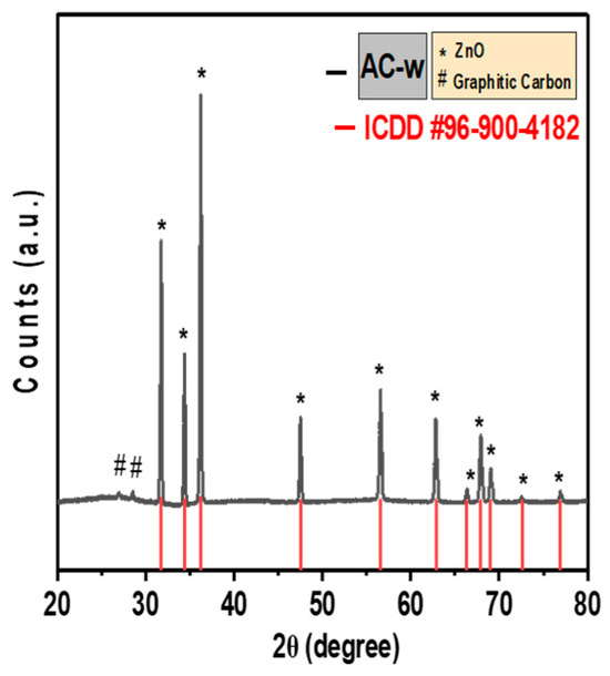 In Figure 2, small peaks at 27° and 28.4° related to 100/101 and 002 planes, respectively, show the existence of graphitic carbon. These peaks are sharp and a little bit shifted to a higher angle due to the presence of zinc oxide (ZnO). Sharp peaks and peaks shifting towards higher angles confirm the crystallinity of graphitic carbon and the shrinking of interplanar spacing, respectively. Further, the presence of micro-graphitic carbon can increase the electrical conductivity required for electrochemical applications [16,17]. Other sharp peaks match with the ICDD #96-900-4182 which clearly reveals the presence of crystalline ZnO. ZnCl2 used for chemical activation as an activating agent was the source for ZnO also. ZnO has a corrosion-resistant property which will prevent electrode degradation. Other properties of ZnO include good transparency and high electron mobility, which favours the engineering of transparent and efficient electrodes for supercapacitors.