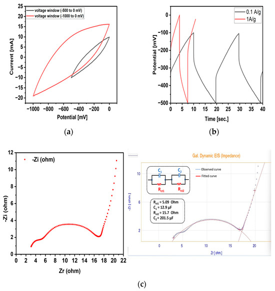 The tilted elliptical shape of CV (Figure 5a) shows the EDLC behaviour (because of no oxidation or reduction peak) of the AC-w as electrode material [20]. In the voltage window from −500 to 0 mV, it shows a specific capacitance of 15.3 Fg−1, while in −1 V to 0 V it shows a maximum specific capacitance of 50 Fg−1. Figure 5b shows GCD curves at different current densities. A specific capacitance of 2.5 and 50 Fg−1 is given by the AC-w electrode at 0.1 and 1 Ag−1, respectively. After that, we calculated the energy density and power density using the above-mentioned formulas. Symmetric electric double layer capacitor showed a max. energy density of 25 Whkg−1 and power density of 10 kWkg−1. Figure 5c is the Nyquist plot obtained from the EIS data analysis, and after that equivalent circuit is obtained by fitting the observed data [7,21]. We fitted the Nyquist plot close to the most relevant equivalent circuit and it showed a minimal equivalent resistance of 2.20 Ω.
