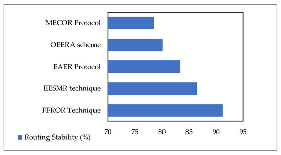 The routing stability is defined using the stable energy nodes and bandwidth utilization rate through the packet transmission from the sender to the receiver. Figure 2 represents the routing stability of three different methods, such as the FFROR Technique, the EAER protocol [1], the MECOR protocol [4], the EESMR technique [25], and the OEERA scheme [26]. The figure shows that the proposed FFROR technique has achieved higher routing stability than the existing methods.