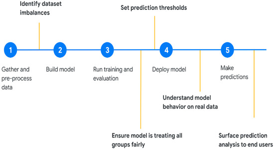 This disaster management model emphasizes the use of machine learning across various phases of disaster management to enhance decision making, improve resource allocation, and aid in carrying out efficient responses and recovery efforts. Collaboration between data scientists, domain experts, and disaster management agencies is essential for the successful implementation of machine learning in disaster management. Data and machine learning algorithms must be fair for safe and responsible AI systems to be built from the ground up. To ensure that issues like AI bias are addressed in a meaningful way, stakeholders in both the technical and business sides of AI are constantly looking for fairness [17]. Fairness provides us with a means of comprehending the practical. Machine learning models can play a crucial role in disaster management by assisting in various phases of disaster preparedness, response, recovery, and mitigation. The overview of a disaster management model that incorporates machine learning is data collection and preprocessing, where data are gathered from various sources, including weather sensors, remote sensing satellites, social media, government agencies, and historical disaster records. The data are cleaned and preprocessed, for example, through data normalization, feature engineering, and by handling missing values [18]. Machine learning models are used for predictive analytics to forecast the likelihood and severity of disasters based on historical and real-time data. Anomaly detection algorithms are deployed to identify unusual patterns in the data that may indicate an impending disaster. Machine learning models are developed to forecast the demand for resources like medical supplies, food, and emergency personnel. Historical data and environmental conditions are used to optimize the allocation of resources to high-risk areas [19].