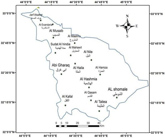 The focus of this research is the spatial distribution of land surface temperature (LST) in the Babylon Governorate. Geographically, Babylon is situated between latitudes N and N and longitudes E and E. As depicted in Figure 1, the governorate is centrally located within Iraq and has an elevation of approximately 37 m above sea level. Covering a total area of around 5119 km2, the region experiences a desert climate.
