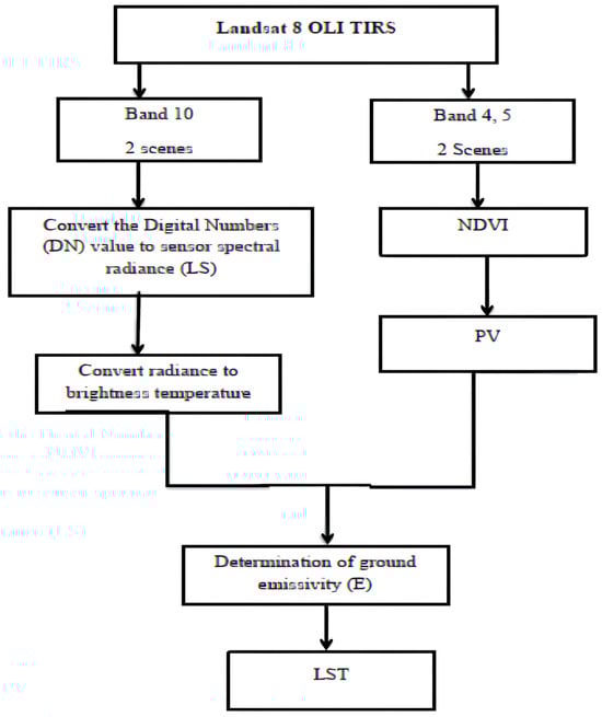 Subsequently, the spectral radiance is converted to brightness temperature () in Kelvin (K) using Planck’s Law and the calibration constants of Landsat 8 OLI ( and ) [9,10]: