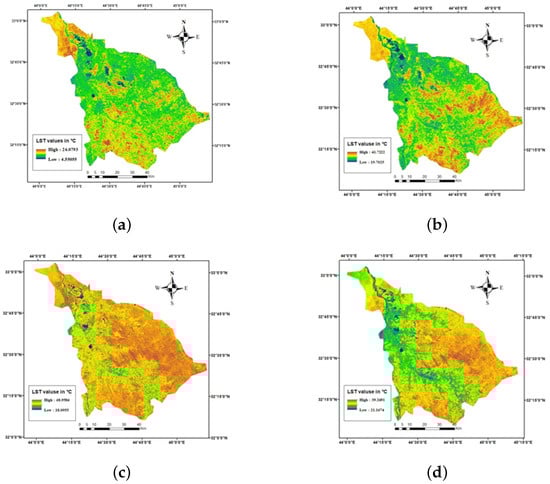 LST distribution of Babylon Governorate across seasons: (a) winter; (b) spring; (c) summer; (d) autumn.