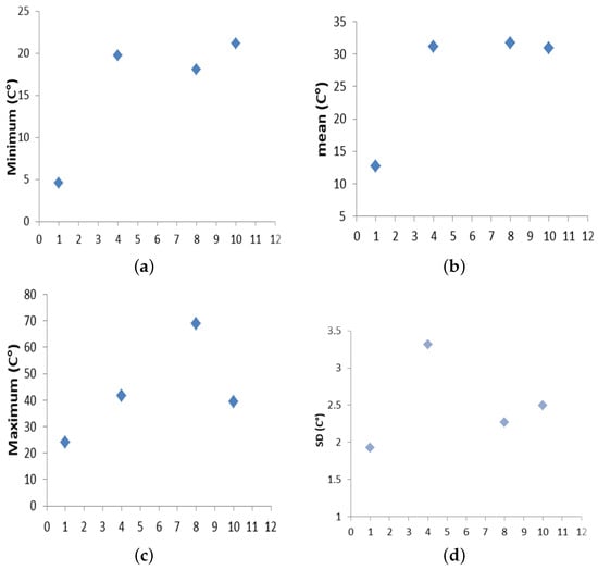 Figure 4 provides further insights into the descriptive statistics for each season during the study period. Specifically, panels (a, b, c, and d) represent the minimum, maximum, mean, and standard deviation of LST in January, April, August, and October of 2023, respectively.