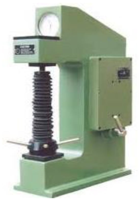 A Rockwell Hardness Tester (M-scale) was used to measure the hardness of the fabricated composite specimen (Figure 6, Make-Saroj Engg. Udyog Pvt. Ltd., Mumbai, India). A quarter-inch ball indenter was used for indentation. A load of 100 kg was applied for the measurement of hardness (red reading).