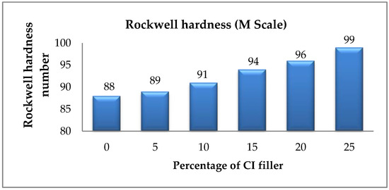 The hardness of neat epoxy is found to be enhanced by adding a cast iron filler (Figure 12). This is due to the uniform distribution of the cast iron in the epoxy matrix. The hardness of the epoxy composites improved significantly as a consequence of the addition of cast iron. It is apparent that a CI filler content of 25% in an epoxy composite shows a higher hardness value, in the range of 3% to 11%, than the other composites; this is because a larger amount of cast iron filler has filled the gap and increased the compactness of the fiber and the matrix.