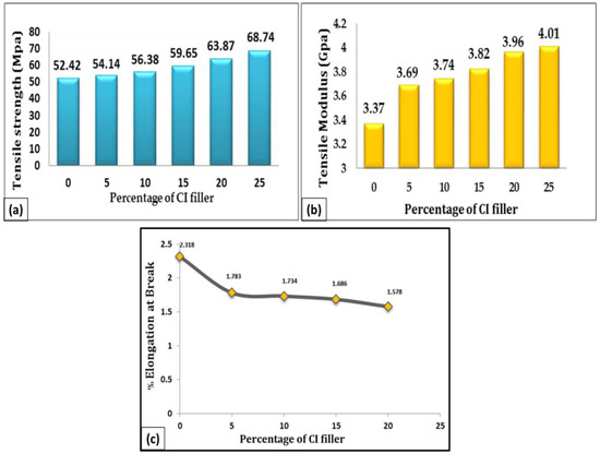 Figure 13a depicts the changes in tensile strength observed in composite materials after the addition of a cast iron filler. It is clear that, as the percentage of cast iron filler increases, so does the tensile strength, which ranges from 7% to 24%. Notably, the composite with 25% of filler has a higher strength, owing to the major impact of the bonding force at the resin–filler interface.