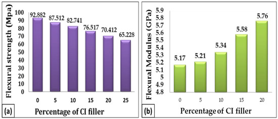 Figure 14b shows the flexural moduli of a neat epoxy and a filler content–epoxy composite. It is apparent that, as the filler content in the epoxy composite increases, the flexural modulus also increases in the range of 2% to 12%. This is due to an increase in the proportion of the hard and brittle phases in the cast iron filler in the epoxy matrix [19].