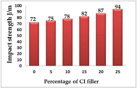 The impact behavior and overall toughness of an epoxy polymer are directly related. The Izod impact test was conducted with pendulum-type impact loading to check the response of a standard composite specimen. The kinetic energy expended by the pendulum in breaking the test specimen was observed. The impact strength values are shown in Figure 15. The impact strength of neat epoxy is less than that of all other specimens. It is apparent that, as the cast iron filler content increases in an epoxy composite, the impact strength also increases in range of 7% to 23%. The epoxy composite with 25% cast iron content shows higher impact strength than the other composites. Cast iron particles dispersed well within the epoxy resin matrix, resulting in a strong interfacial connection. This strong interfacial bond between the fiber matrix and the iron filings contributed to the material’s increased impact resistance, which is consistent with previous research [20,21,22,23].