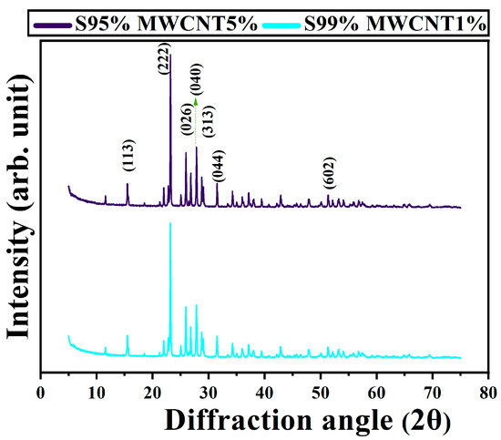 XRD spectra for S99% MWCNT1% and S95% MWCNT5%.