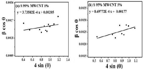 W-H Plot for (a) S99% MWCNT1% and (b) S95% MWCNT5%.