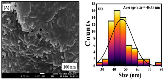 Figure 5A,B represent the FESEM micrographs of (A) S 95% MWCNT 5% and (B) S 99% MWCNT 1%. Figure 6A represents a magnified view at 100 nm of S 95% MWCNT 5%. Alongside, Figure 6B represents the counts vs. size (nm) histogram curve for Figure 6A. In Figure 5A,B, composite particles appear to be round, with some degree of agglomeration. MWCNTs have fibrous structures, and sulfur has a round structure. Figure 6A represents mixed fiber/round morphologies. The particle size calculated from Figure 6B shows an average particle size of 46.45 nm.