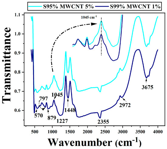 KBr-FTIR interferogram for S95% MWCNT5% and S99% MWCNT1%.