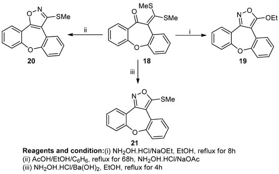 Sarvesh Kumar et al. studied the heteroaromatic annulation of 10,11-dihydro-11-[bis(methylthio)methylin]dibenzoxepino[4,5]-fused heterocycles (Scheme 8). The reaction of 10,11-dihydro-11-one with sodium hydroxide with carbon disulfide at 0 °C in THF, along with alkylation with methyl iodide, produced an α-oxoketene dithioacetal (18). When compound (19) reacted with hydroxylamine hydrochloride in the presence of sodium ethoxide in refluxing ethanol, a 3-ethoxydibenzenopino[4,5-c] isoxazole (20) was obtained, whereas in the presence of a non-nucleophilic base like barium hydroxide, 3-(methylthio)dibenzoxepino-[4,5-c]isoxazole was produced with an 86% yield, and in the presence of sodium acetate–acetic acid buffer, a regioisomeric 3-(methylthio)-dibenzoxepino[4,5-d] isoxazole (21) was obtained [14].
