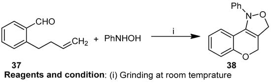 Zigmee T. Bhutia et al. worked on the in situ mechanochemical synthesis of nitrones followed by 1,3 dipolar cycloaddition, providing a catalyst-free, “green” route to obtain cis-fused chromano-[4,3-c]-isoxazole (37) (Scheme 14). Grinding an equimolar mixture of o-allyl salicylaldehyde and phenylhydroxylamine resulted in nitrones, and then intramolecular cycloaddition of the nitrones yielded compound (38) [20].