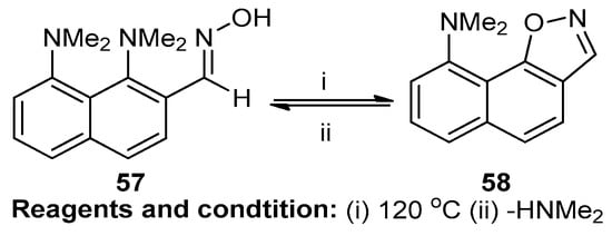 Alexander and co-workers studied the sterically facilitated intramolecular nucleophilic NMe2 group substitution for the synthesis of fused isoxazoles (Scheme 22). It is a SNAr aromatic nucleophilic substitution reaction. The compound 1,8-bis(dimethylamino)-2-naphthaldehyde oxime (57) was converted at 120 °C, and the substitution of the NMe2 group yielded the fused isoxazole N,N-dimethylnaphtho[2,1-d]isoxazole-9-amine (58) [28].