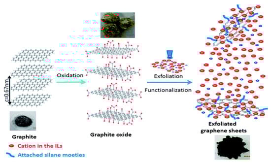- Fu, Y.; Zhang, J.; Liu, H.; Hiscox, W.C.; Gu, Y. Ionic Liquid-Assisted Exfoliation of Graphite Oxide for Simultaneous Reduction and Functionalization to Graphenes with Improved Properties. J. Mater. Chem. A 2013, 1, 2663–2674. [Google Scholar] [CrossRef]