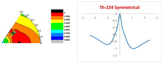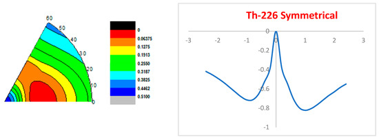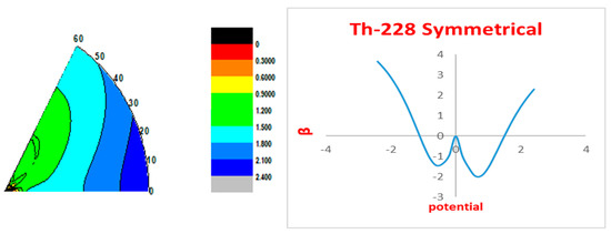 228Th, refers to asymmetry in both sides and unequal distribution in contour lines with less potential energy than the previous reach to 240 MeV because there is stability in this isotope near the closed shell 126.