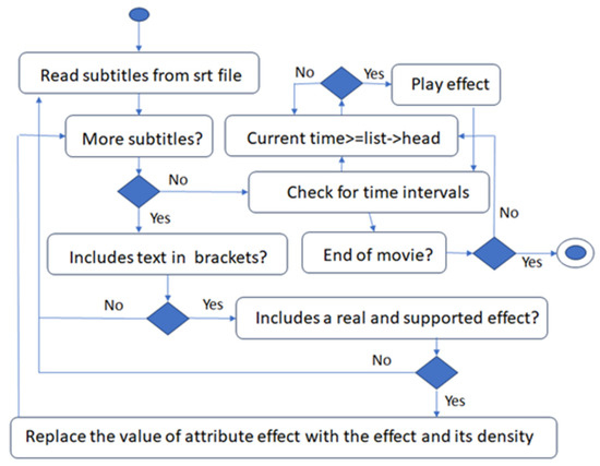 This paper presented a comprehensive approach that encompasses various aspects of integrating immersive special effects into digital content. Our approach relies on the idea of enhancing subtitle files through embedding clues about the virtual firm special conditions inside square brackets. We showed how these clues can be converted to special effects such as spraying, scent release, modifying light, temperature manipulation, vibration, and motion, like the ones available in multidimensional cinemas (4D, 7D, etc.). Specifically, we proposed an algorithmic procedure for how to automate the extraction of these special effects from corresponding “srt” subtitle files or even firm images. Our approach also facilitates the conversion of the extracted special effects into a generic format that can be played by hardware defined as special effect generators. This paper also provided guidelines for how special effect players can be developed. The main limitation of this work is that it is still at the conceptual level and a lot of implementation details were not included. For example, it was not specified how to synchronize the movie, especially if the viewer pauses, goes backward or forward, or restarts it. In the future, we aim to implement a holistic system that will include a special modified film, a special effects player, and the special effect generator device and to further test and develop the approaches proposed in this paper.