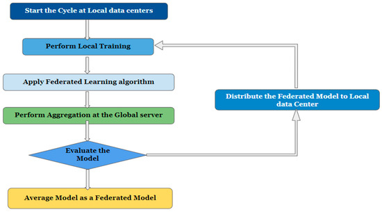 - Global aggregation: Here, training outcomes are aggregated globally, meaning that all participating local centers report back to an aggregation server. The server then applies the changes made at the regional nodes to the global model parameters. The term “global training” describes this method [11]. The flowchart of the federated learning framework is shown in Figure 2.