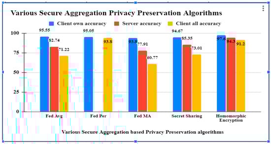 As per the results obtained from different secure aggregation privacy preservation algorithms, it has been observed that the accuracy of all the algorithms are good, but Table 2 shows that Homomorphic encryption secure aggregation is preserving the privacy of the healthcare data by observing the Health Insurance Portability and Accountability Act (HIPPA) and General Data Protection rules (GDPR) standards with security, efficiency and reliability parameters. The related comparison is shown in Figure 3. The Blue bar in Figure 3 represents client own accuracy, red bar represents server accuracy and yellow bar represents client all accuracy.