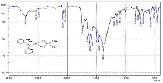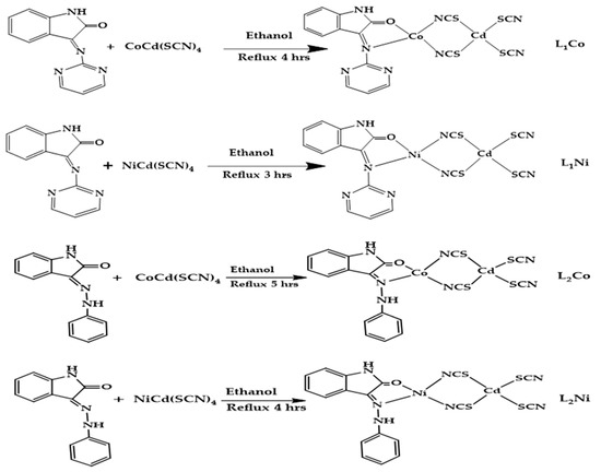 Schiff bases are condensation products formed between primary amines and ketones or aldehydes under specific conditions [1]. These compounds are known for their ability to stabilize metal ions in various oxidation states and are involved in a wide range of catalytic and industrial applications. Furthermore, they exhibit extensive biological activities [1,2]. Despite being discovered nearly a century ago, Schiff bases continue to be essential ligands in the realm of metal coordination chemistry. They are especially noteworthy as macrocyclic ligands due to their multifaceted applications [3,4,5]. Isatin-derived Schiff bases are integral in the synthesis of various pharmaceutically active components. These bases are renowned for their antimicrobial, antiviral, and antitumor properties [6,7,8]. Bimetallic thiocyanates that incorporate Schiff bases have also garnered attention, particularly in biological applications, owing to their coordinated systems that feature thiocyanate (SCN) bridges [9,10]. The primary objective of the current research encompasses the preparation, spectroscopic characterization, and biological evaluation of selected Schiff base ligands and their tetrathio-cyanate complexes. These complexes have the general formula [LMCd(SCN)4], where M is either Co(II) or Ni(II) ions, and L represents the Schiff base ligand.