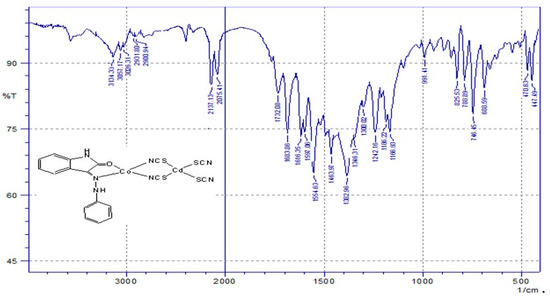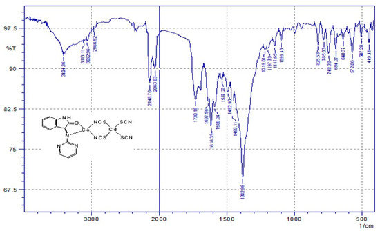 The spectra of the prepared complexes also featured new bands in the ranges of 2063–2088 cm−1 and 2137–2148 cm−1, attributed to nitrogen-bonded and sulfur-bonded thiocyanate, respectively [12]. Additionally, bands in the range of 510–573 cm−1 were ascribed to the formation of M–N bonds [13].