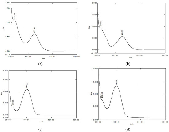 The UV-Vis spectra of the Schiff base ligands and their complexes are presented in Figure 9. The ultraviolet-visible spectra of the Schiff base ligands exhibited absorption bands at 280 nm and 295 nm, respectively, ascribed to π–π* transitions of the azomethine group. Bands appearing at 460 nm for L1 and 404 nm for L2 were suggestive of π–π* transitions in aromatic rings, internal charge transfer, or carbonyl groups [14].