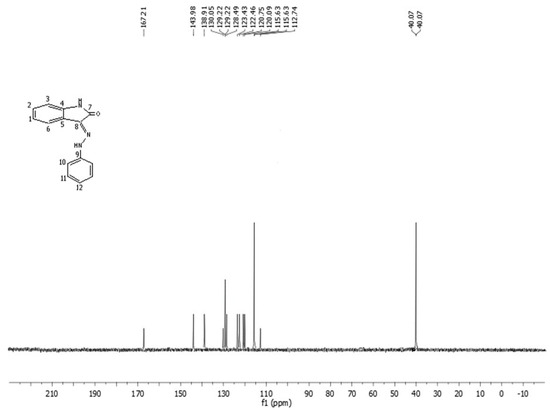 Both the 1HNMR and 13CNMR spectra of the ligands showed all the expected signals as shown in Figure 10, Figure 11, Figure 12 and Figure 13. The chemical shifts for 1HNMR, 13CNMR are detailed in Table 5 and Table 6, respectively. The mass spectra indicate the presence of molecular ions and other characteristic peaks, further validating the chemical structure of the ligands [13]. The mass spectrum of ligand L2 is shown in Figure 14 and Figure 15.