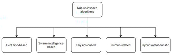 A few of the most commonly used classes of metaheuristics, described below, are capable of solving problems for which even the most powerful classical computers cannot be programmed. Contingently as per their behavior, metaheuristic breakthroughs could be classified within four distinct classifications: human-related, physics-rooted, evolution-based, and based on swarm intellects. The field of nature-inspired intelligent algorithms has a rich history, stretching back to its early development years. These algorithms, often referred to as NII algorithms, are intelligent metaheuristic optimization techniques known for their ability to refine candidate solution populations using information acquired during the algorithm’s execution. The birth of this field can be traced back to the introduction of the first genetic algorithm by Holland in 1975, which ignited a spark for the development of NII algorithms. Although genetic algorithms are not typically categorized as NII methods, they paved the way for scientists to examine other natural concepts that could be modeled for high-performance optimization. The first such algorithm, known as “Simulated Annealing”, was put forth in 1983 by Kirkpatrick et al. [] This algorithm was modeled after the annealing process in metallurgy and has since become one of the most recognized optimization methods.