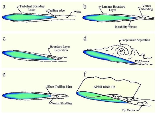 Various self-noise generation mechanisms: (a) noise at trailing edge due to turbulent boundary layer; (b) noise due to vortex-shedding with laminar boundary layer; (c) separation-stall noise with a slight angle of attack; (d) separation-stall phenomenon with a large angle of attack; (e) noise due to vortex-shedding and trailing-edge bluntness; (f) tip vortex noise [].