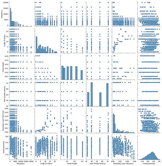 The data did not have any missing values and were used without undergoing any normalization process. However, data randomization was carried out to omit any biases in the original order of data, and five-fold cross-validation was employed to assess the model’s performance. Since there are five input features and only one output feature (scaled sound pressure), a pair plot data visualization was used to explore their relationships; the pair plot creates a matrix of scatterplots, where each scatterplot represents the relationship between two given variables, as shown in Figure 2.