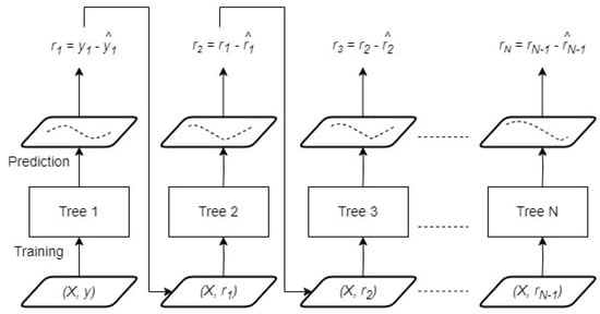 GB is a robust boosting algorithm that utilizes multiple weak learners to create a strong learner. It works iteratively, wherein each new model is trained to minimize the cost function or error based on the predictions of the prior model. The main idea is to gradually improve the ensemble’s predictive ability by addressing the mistakes made by the previous models. A weak learner is a model that performs marginally better than random guessing on a given task. The ensemble comprises M trees, as shown in Figure 3.