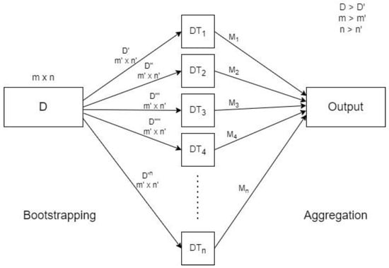 RF is an ensemble learning method suitable for regression and classification work. It combines the power of multiple decision trees and a technique known as Bootstrap and Aggregation, or bagging, as shown in Figure 4. It involves randomly sampling rows and features from the dataset to create sample datasets for each tree; this process is called Bootstrap. The Aggregation step combines the predictions of all the individual trees to produce the final output. While RF constructs multiple decision trees and averages their predictions, GB and XGBoost build models sequentially to rectify the mistakes of previous models. RF performs well with unseen data, is less prone to overfitting, and is computationally efficient. The final prediction is given in Equation (2).