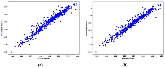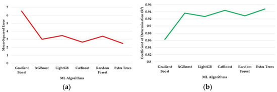 The visual demonstration of how well the model captures the underlying patterns in the data is shown in Figure 5a,b, wherein the predicted values can closely align with the actual values, forming a linearly fitted curve. However, in some cases, outliers may exist, which indicates the model’s potential areas of improvement. Figure 6a,b show the graphically comparing mean-squared error and coefficient of determination for different machine learning algorithms.
