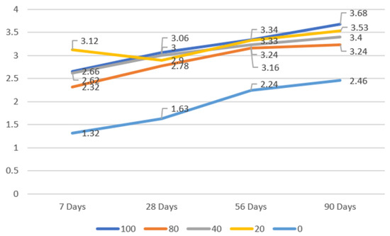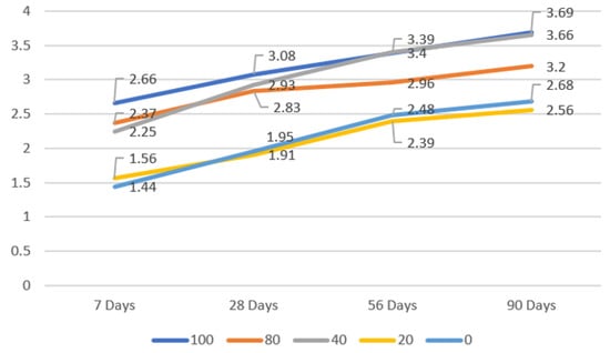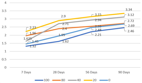 The examination of flexural strength incorporating cement, sand, and copper slag subjected to air cooling is detailed in Table 5 and depicted in Figure 3. The experimental design involved combining half of the cement with an equal half mixture of sand and copper slag. It was found that a blend of 100% sand with cement increased the flexural strength by 38.72% over a cooling period from 7 to 90 days. Similarly, a blend of 100% copper slag with cement resulted in an increase in flexural strength by 86.1% over the same period. When analyzing the 80–20% (sand–copper slag) mixture, there was a 35% increase in flexural strength, whereas the 20–80% (sand–copper slag) mixture resulted in a 64% increase. Notably, a 40–60% (sand–copper slag) mixture led to an increase in flexural strength of as much as 62.7%.