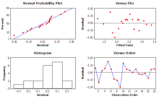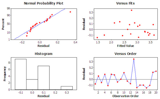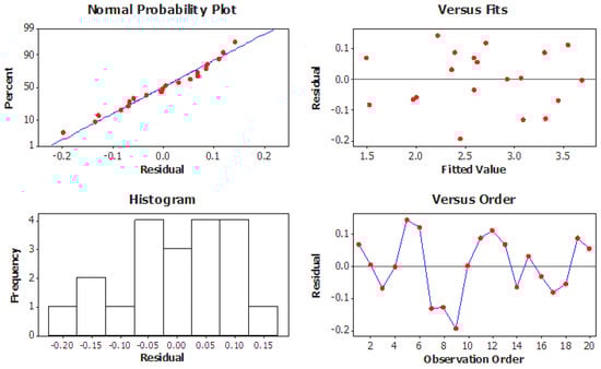 A two-way Analysis of Variance (ANOVA) was performed to ascertain if significant variations exist in the flexural strength of the cement composites, influenced by the combination proportions and the duration of cooling. The analysis indicated that the flexural strength of the cement composite with iron slag and copper slag varied significantly. This was true both for the different material proportions and for the number of cooling days (, ; , ), as shown in Table 6. Residual plots depicted in Figure 4 suggest a normal distribution of the data and the spread of data points around the mean, confirming the model’s adequacy. Standard deviation (S) is reported at 0.1635, with the model explaining 95.11% of the variance (), adjusted for degrees of freedom ().
