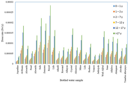 The mean 222Rn concentration across all samples was 4.58 Bq/L. These variations are likely influenced by the distinct geological characteristics of the water sources, affecting the radioactive content in the soil and rocks. Notably, all measured 222Rn concentrations were below the regulatory threshold of 100 Bq/L [12]. Correlation was observed between samples showing high radioactivity and elevated TDS values, indicating a direct relationship between the concentration of dissolved solids and 222Rn radioactivity levels. This observation was further substantiated by data from the Tigris River in Baghdad, which displayed a 222Rn level of 42 Bq/L and a TDS value of 472 ppm. Hence, water purification methods that effectively remove solid materials could potentially reduce 222Rn levels. To evaluate the potential health risks associated with long-term consumption of the analyzed bottled water, annual effective doses (AEDs) were calculated using Equation (2). The AED results, categorized by age and further divided into six groups (G1–G6), are presented in Table 3. The highest dose recorded was Sv/y for adults aged over 17 years, and the lowest was Sv/y for infants aged 0–1 years. All calculated doses were found to be well below the reference dose level of Sv/y [19], thereby indicating negligible health risks under standard conditions. Figure 1 further elucidates these dose assessments, revealing the highest and lowest dose rates to be Sv/y and Sv/y, attributed to the Royal and Aquafina brands, respectively.