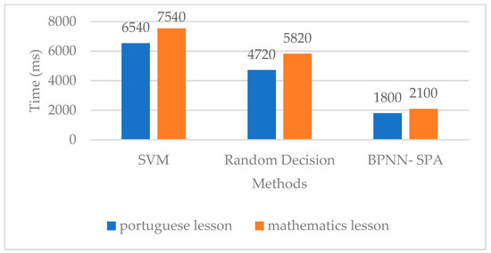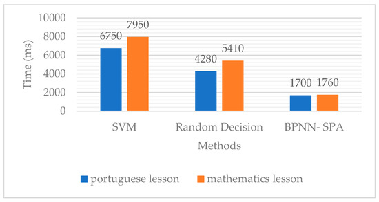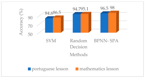 Figure 4a,b show the performance analysis of binary classification. It is obvious that the proposed BPNN-SPA performs better than other algorithms. Figure 5 depicts the accuracy of the proposed algorithms, and Figure 6 illustrates the time taken for each algorithm for binary classification.