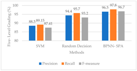 Figure 7 shows the performance analysis of five-level grading. It is obvious that the proposed BPNN-SPA performs better than other algorithms. Figure 8 depicts the accuracy of the proposed algorithms, and Figure 9 illustrates the time taken for each algorithm for binary classification.