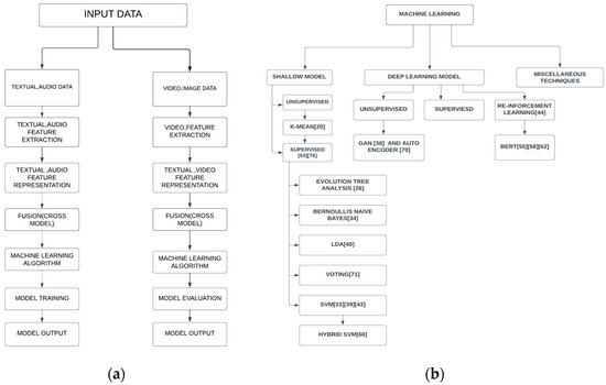 The model is designed to handle various data types, such as text, image, audio, and video. The architecture comprises several elements and procedures, including data input, feature extraction, feature representation, cross-modal fusion, machine learning algorithms, model training and evaluation, and model output. The model receives different data types and undergoes specific feature extraction techniques tailored to each type. The extracted features are represented in a standard format and fused using cross-modal fusion techniques. Machine learning algorithms, such as classification or regression algorithms, are then applied to the fused feature representations to predict the authenticity of the news. The algorithm is trained on labeled data and its efficiency is evaluated using appropriate measured metrics. Finally, the model generates the output, indicating whether the news is fake or genuine. This architecture provides a comprehensive framework for an effective FND model considering various data types, as shown in Figure 2a,b.