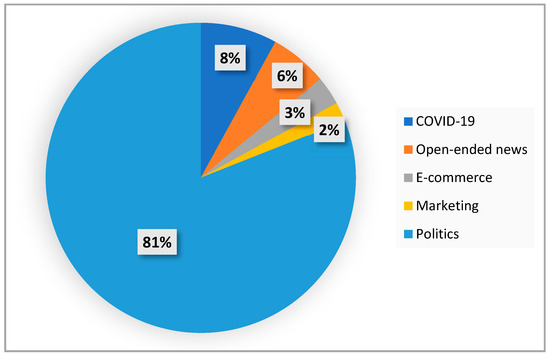 Fake news can permeate fields such as health, education, democracy, politics, COVID-19, and more, posing detrimental effects on individuals and society. Therefore, recent FND models have concentrated their applications in different domains, as depicted in Figure 3. A significant portion of the analyzed articles primarily emphasize politics. The remaining studies delve into FND within domains such as culture, tourism, COVID-19, e-commerce, and marketing. This analysis provides valuable insights for future researchers, allowing them to explore emerging fields and gather innovative information for advancing FND models.